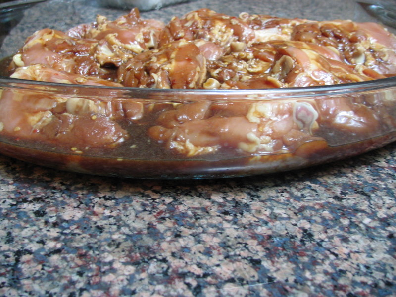 The marinade is added to about 1/4 of the height of the chicken pieces….