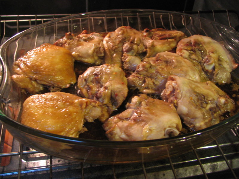 Remove chicken from marinade and place all pieces skin side down in a single layer. Pour some of the marinade over them, to reach the level of the bottom fourth of the layer (see photo after the jump). Bake, covered with aluminum foil in a 325F oven for 1.5 hours. Remove the foil, turn the chicken pieces skin side up, and bake at 425F for 20 minutes more. If you like a particularly crispy skin (we do!) turn the broiler on and watch carefully, as the honey from the marinade might burn.