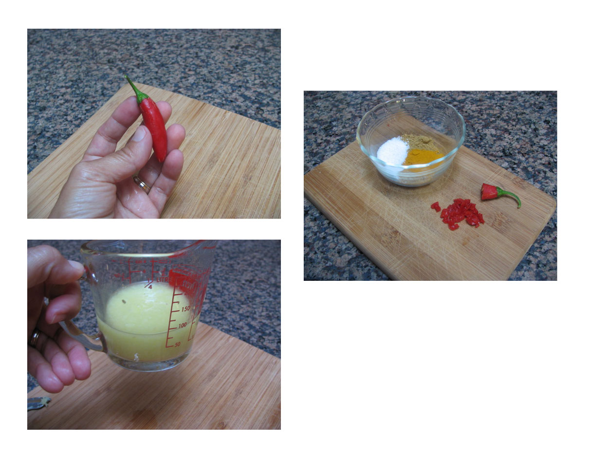 Also, the original recipe called for jalapeno pepper, but I had a very special pepper available, that came from our garden… a nice, ripe, red serrano… How could I resist it? In the composite photo, you can see the prep work, serrano pepper, mixture of spices, and the ginger paste that is the basis of the curry, imparting huge flavor.