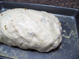 Proceed to kneading the dough three times at 1o minute intervals. Each kneading cycle will last only 10-15 seconds. After the last kneading cycle, let it rest for 10 minutes and form it into a rectangle. Fold it by thirds like a letter, let it rest for 1 hour. Stretch the dough again, fold it by thirds, allow it to rest for another hour. Shape the dough very gently into a rectangle and pat the surface with your fingers to flatten it slightly. Sprinkle cornmeal on the surface, cover with a cloth and allow it to rise for 45 minutes.