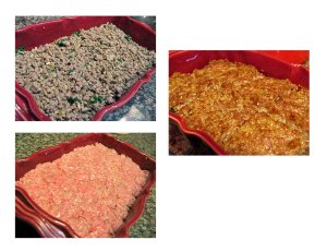 This composite photo (click to enlarge it) shows the addition of the filling (cooked ground beef), the addition of the top layer (raw beef/bulgur), and the kibbe right out of the oven.