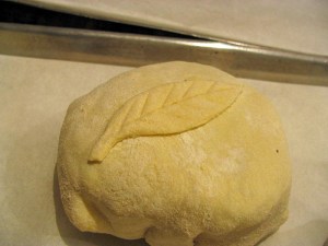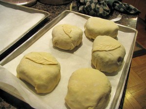 Forming the Wellingtons: enclose the meat with the rolled out puff pastry, try to work a bit fast on a floured surface, because you don’t want the butter in the pastry to melt. The small leaves were made by my sous-home-chef, who deserves promotion ASAP… Remember to cut a couple of slits on the surface of the pastry to allow steam to escape during cooking, or the pastry might burst open.