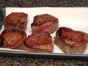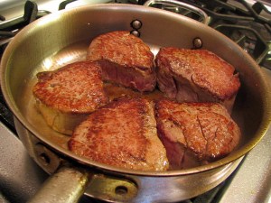Searing the meat. High heat, only 2 minutes per side, to avoid the perils of overcooked meat at the end. I don’t brown the sides of the filets, it’s just unnecessary: only sear the top and bottom. Two tips on browning any meat: don’t overcrowd the pan, and make sure the meat is absolutely dried of any moisture, using paper towels to blot it before searing.