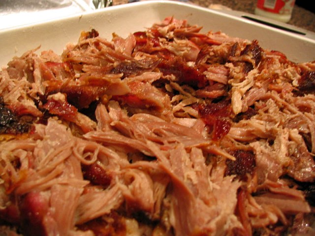 Pull the pork into pieces with forks, allowing some bits to fall on the floor to the delight of your dogs.
