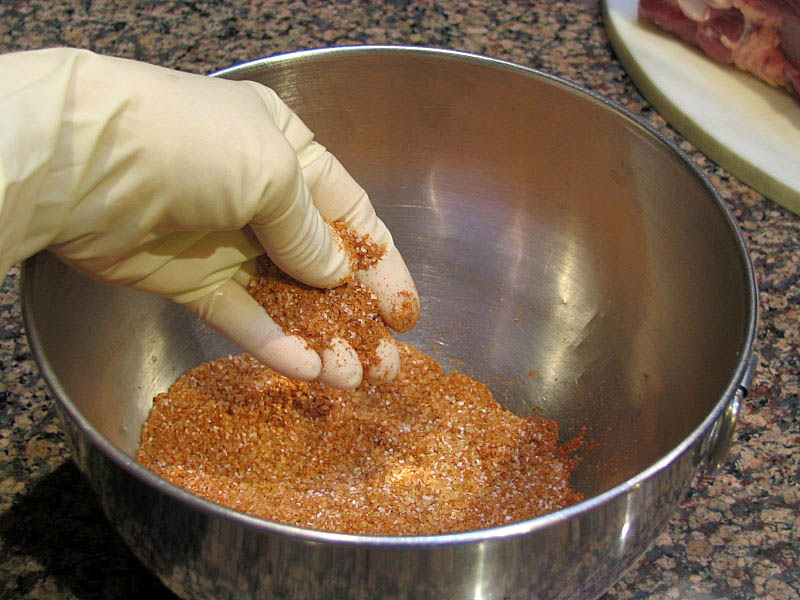 Mix all the ingredients (except the meat) in a bowl to prepare the dry rub (it´s a good idea to wear gloves).