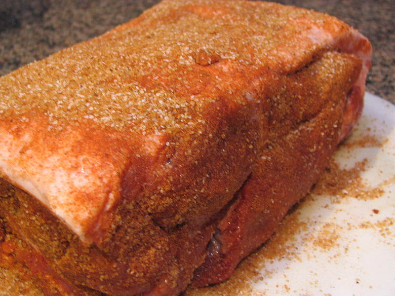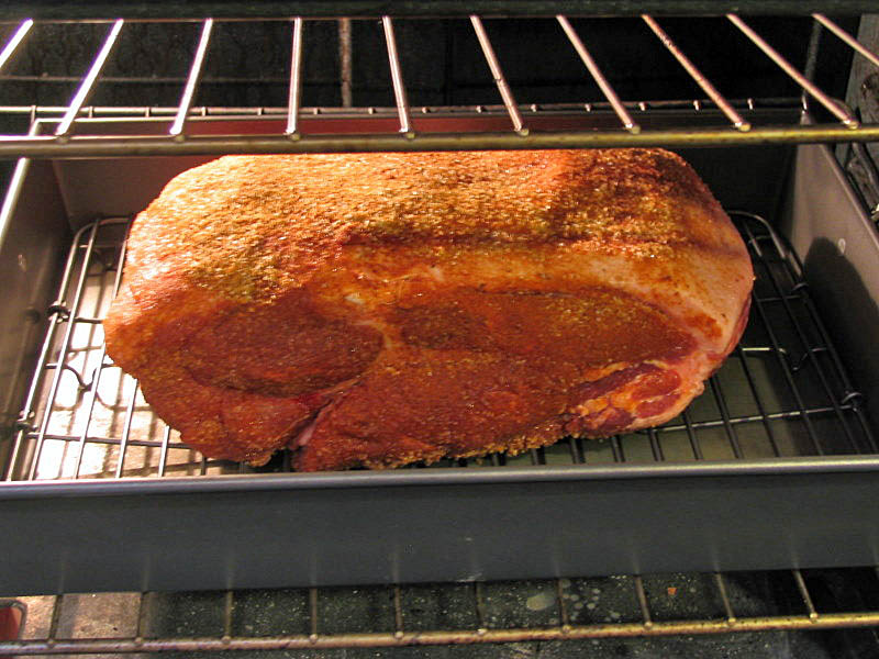 Rub the pork all over with half of the dry rub, then place it in a plastic bag and refrigerate overnight. In the morning remove the pork from the bag and cover it with the rest of the spice mixture. If possible, let it sit at room temperature for a couple of hours, if not just place it in a 275F oven, uncovered on a rack in a roasting pan.