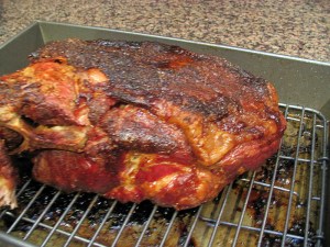 Roast until tender, almost falling apart. Depending on the size, it will take 7 – 9 hours. Longer will not hurt it; the desired internal temperature is 200F.