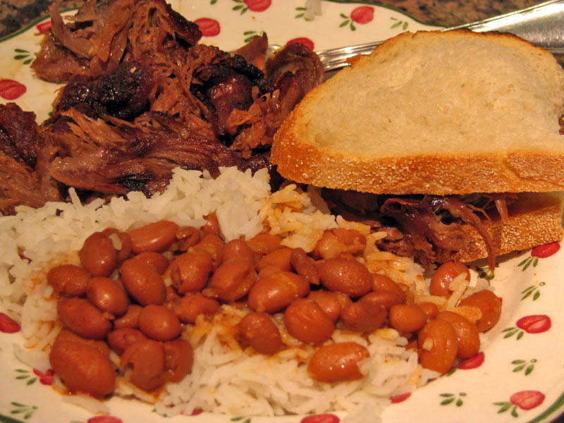 Serve the meat over sandwich buns with the sauce of your choice, or follow my “Brazilian variation”: transfer the pulled meat to a clean baking dish. Add 1 cup of water to the roasting pan and place it over the stove-top burner on medium heat to dissolve the bits of pork goodness that stuck to it during the long, slow roasting. Strain it over a pyrex cup and allow the fat to rise to the top, then discard it. Use the liquid to moisten the pulled meat, squeeze fresh lemon juice all over, cover with aluminum foil and place in a 350F oven for 20 minutes before serving over rice and beans. (You can leave it in the oven for longer, it only gets better).