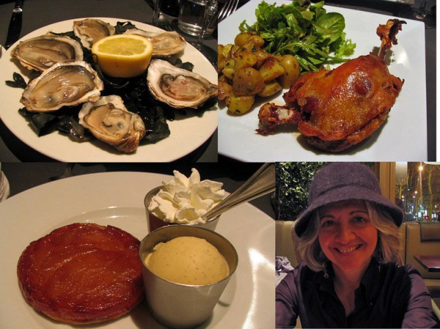 What’s for dinner? It was a simple meal at Le Bosquet, a classic brasserie two blocks from our hotel. The same waiter from several years ago handed us a menu that was almost unchanged. Why change oysters, confit de canard, and tarte Tatin? 😉