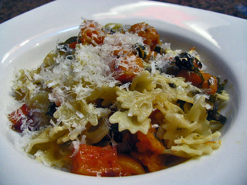 SWEET ROASTED BUTTERNUT SQUASH AND GREENS OVER BOW-TIE PASTA