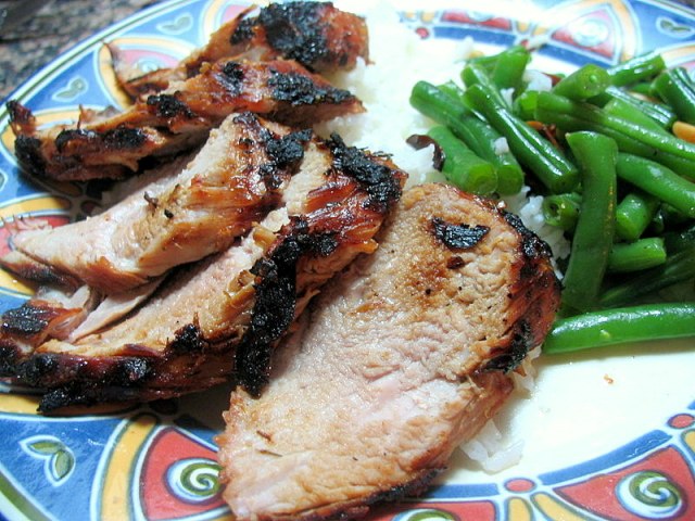 Comments: The published recipe suggested brining the meat first, then brushing it with the glaze of your choice. I opted for a lemony marinade instead.  Pam Anderson offered three options on the glaze,  all using frozen fruit juice concentrate as the starting point.  We usually don’t stock those in the freezer, so I went with melted orange marmalade instead, adding a little vinegar to cut any excessive sweetness.   During grilling the sugar will impart a deep copper color to the meat, something that we all associate with great taste… and it had that for sure!   I served the meat over plain white rice, without any sauce, but with crisp-tender green beans and almonds, one of our favorite side dishes. Leftovers are great for sandwiches, fajitas, or simply re-heated in the microwave.  Give this recipe a try, and it might become one of your favorite weeknight options!