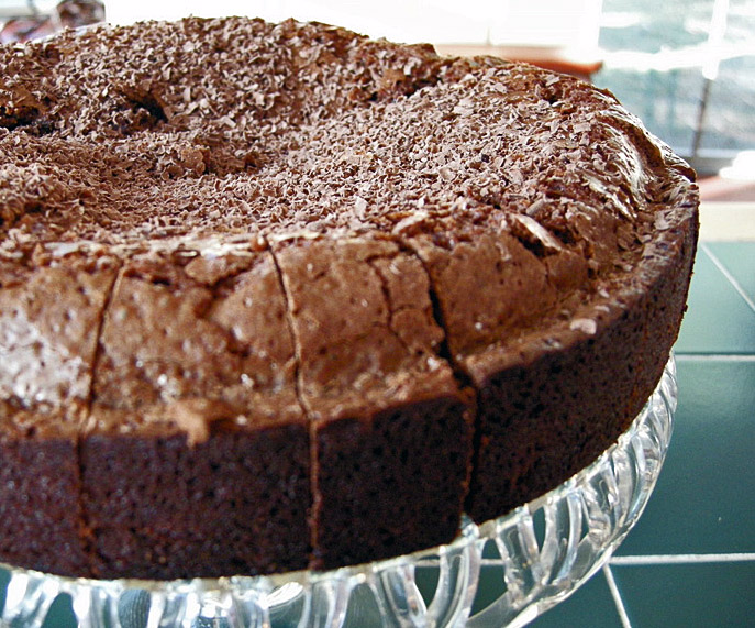 I admit to shedding a few tears. The saint I married assembled the pieces on a baking sheet, placed them back in the oven at a mellow 325 F for 30 minutes, and I regained my composure. Once both the cake and I had cooled off, I shaved chocolate all over to cover the abuse.