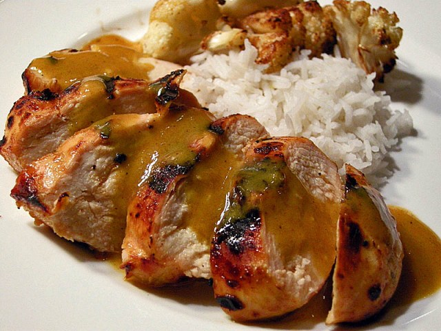 Remove the chicken from the marinade, season lightly with salt, and grill until done but still tender. While the chicken is grilling, warm the reserved marinade. When the chicken breasts are cooked, let them rest at room temperature for a few minutes, slice, and arrange on a serving platter, and drizzle the sauce over the meat.