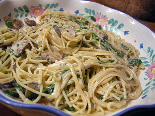 Note to self: to make it even faster, saute the mushrooms in advance, and re-warm them right before adding to the pasta.