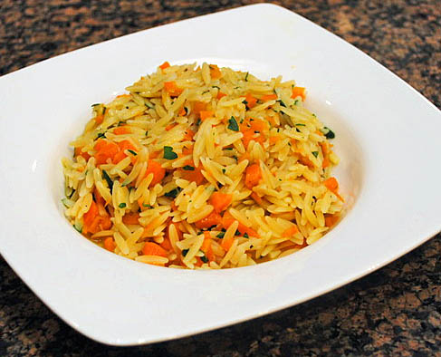 Comments: If all recipes in this cookbook please me as much as this one, it will be hard to cook from a different source! 😉 Toasting the orzo and treating it like Arborio rice in a risotto preparation considerably changes the texture of the pasta. Orzo has a tendency to be a bit “slippery”, but not in this dish: it feels wholesome, binding nicely with the other components. The bits of carrots give a hint of sweetness and add a lot to the dish. I had to exert extreme self-control to put the leftovers in the fridge, instead of leaving them in front of us while we talked after dinner. Those can be very caloric conversations!