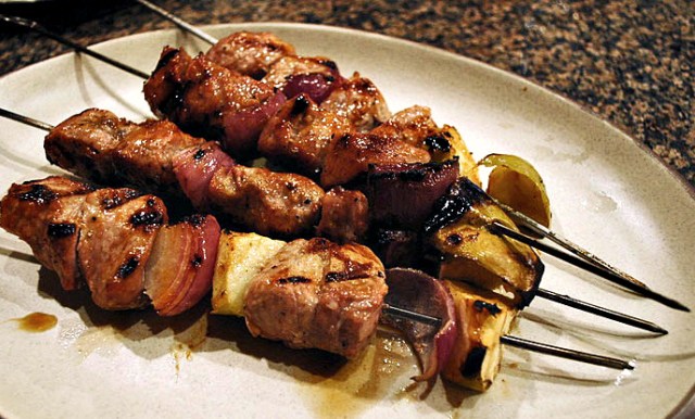If using wooden skewers, soak them in water for several hours. Assemble long skewers alternating pieces of pork, onion, and apple wedges. Start with t a piece of meat, and end with a piece of apple. Reserve. (This step can be made several hours ahead of grilling).