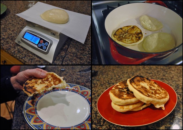 As you roll each one, place it on a skillet coated with a light spray of oil (well seasoned cast iron, or non-stick), and fry each flatbread until nicely browned on both sides.  Transfer it to a plate and proceed to cook the next one.   Or, if you roll them a little smaller, fry as many as you can fit in your pan, but don’t allow them to touch.