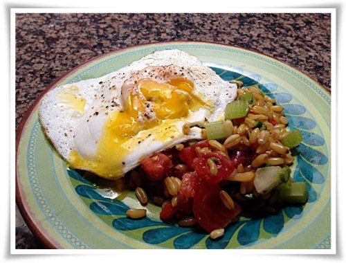 When ready to serve the salad, mix the cooked kamut with the veggie/vinaigrette mixture, add the tomatoes, and adjust seasoning with salt and pepper. If you like, add some lemon zest on top. Enjoy it as a side dish for meats, or with a “figure-friendly” sunny-side egg on top. It is also excellent all by itself.