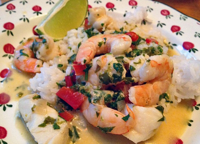 Comments: The original recipe used halibut, but I substituted cod because our grocery store had gorgeous looking cod that day, whereas the halibut seemed a bit sad (or, to quote a favorite French expression of mine: pas fameux ;-)). My other modification was to use green curry paste instead of red, because that’s what I had in my pantry. As to coconut milk, I almost always use light because it works well for this type of recipe. It is slightly less dense, but feels rich and flavorful enough, with the added bonus of lower fat content.