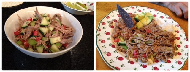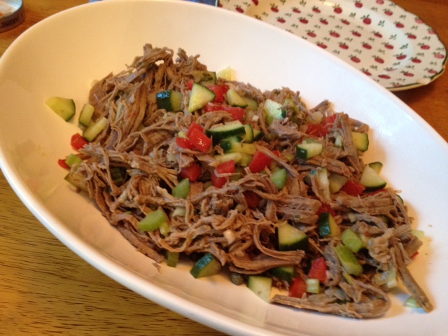 Comments:  I was not sure if Phil would like this recipe, as beef salad is not something he would normally go for. To my delight, he absolutely loved it, and kept telling me to include salpicon in our regular rotation.  I suppose that every food blogger’s partner lives in fear of never tasting a dish again once it is published in the blog… 😉   No risk with this one,  because I already made it twice!  The second time I used top round, a cut that is not that popular for its fibrous nature, but  perfect for this dish.  I used my pressure cooker, and advise you to do the same if you have one and would like speeding up the process.  The recipe makes a pretty big batch, so leftovers were my lunch for several days. But, as  Marcela mentioned in the show, it’s great to have a batch of salpicon in the fridge for little snacks throughout the day.