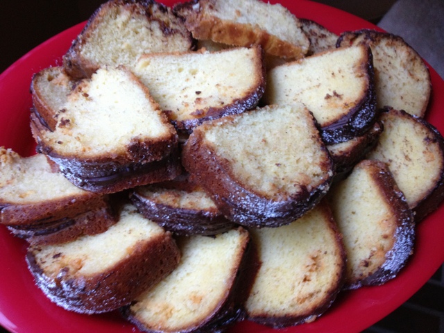 Time to ice the cake. That’s when the road got a little bumpy.  I should have read Celia’s post more carefully. She added a note to say that the white chocolate ganache is usually too liquid, so she prefers to simply melt the pure white chocolate to drizzle on top.  Well, my ganache was so liquid it disappeared into the cake.  I also did not do a very good job with the dark chocolate drizzle, so in the end I covered the whole cake with powdered sugar on top of the drizzle for cosmetic reasons.  Over-kill? Maybe.  I do agree with Celia, though. This cake is so amazing, a simple dusting with powdered sugar is more than enough.  We took a platter to the department and everyone loved it!