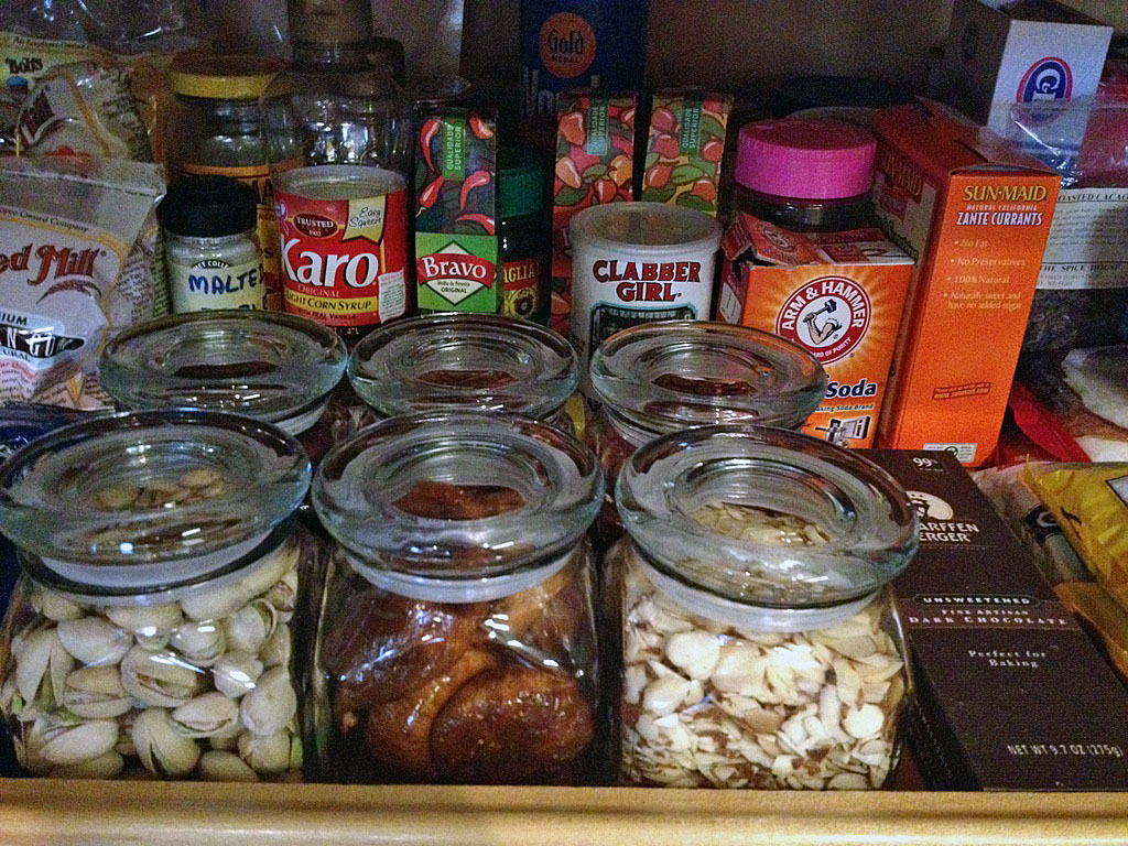 A collection of glass containers of several sizes and shapes, to bring some sense of peace and beauty to our pantry…