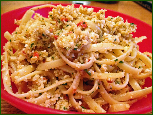 Can I share a little dirty secret? I did not add garlic… I posted the recipe as written because I understand our dislike of strong-tasting garlic is uncommon… 😉 But maybe also it could have something to do with how finely the cauli gets processed, so that it cooks in contact with the hot pasta….