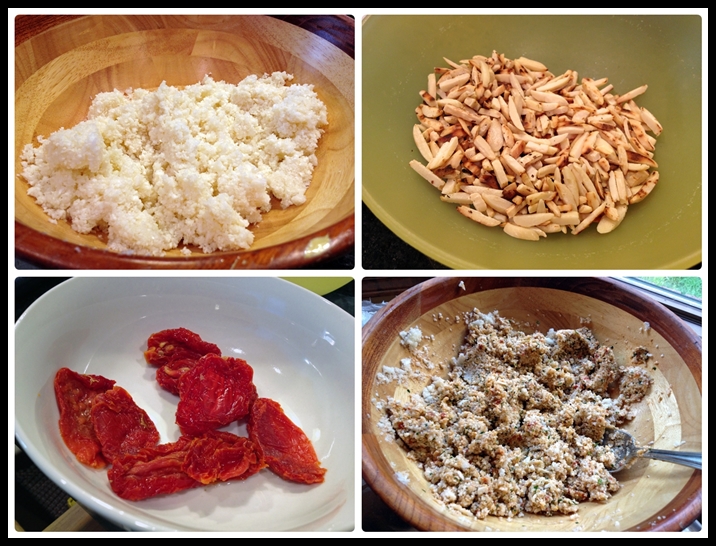 Cover the sun-dried tomatoes with boiling water in a small bowl and let them stand for 5 to 10 minutes to soften. Drain well and chop them coarsely. Rinse the cauliflower, cut off the leaves and hard stalks. Cut the rest into chunks, and add to a food processor, processing them until they are more or less the texture of couscous. Transfer to a large bowl and reserve while you prepare the other ingredients.