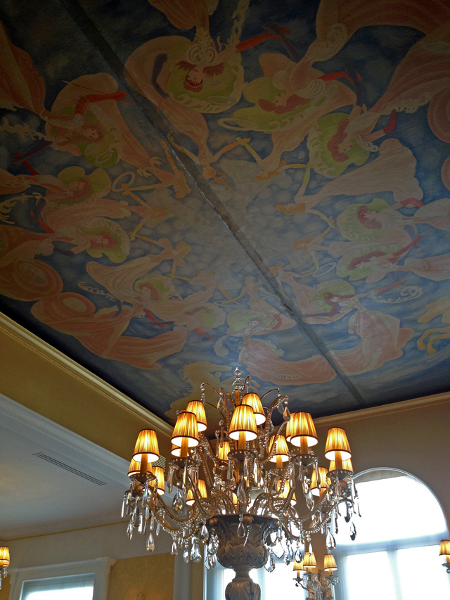 Back in 2002, when we were in Paris for a full year, we went to several special restaurants like La Tour d’Argent, Le Jules Verne (at the Eiffel), Taillevent, Le Violon d’Ingres, Benoit, Clos des Gourmets, and Lasserre (at that time for dinner).  In my opinion,  Taillevent (reviewed here) and Lasserre tie for first place as far as dining experiences go.  Of course, the view from Jules Verne is spectacular, the location of La Tour d’Argent cannot be beat, but Lasserre has a touch of elegance and charm that is quite unique. Also, a special added bonus: a ceiling that can be kept closed (showing a painting of dancers and angels by Touchagues) or open to the sky on beautiful nights and sunny days.