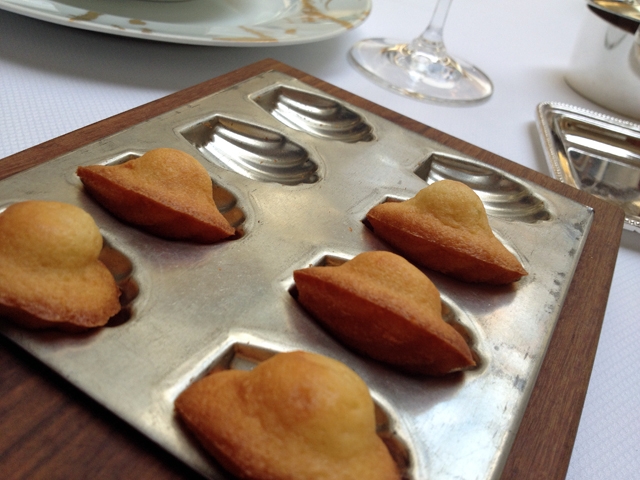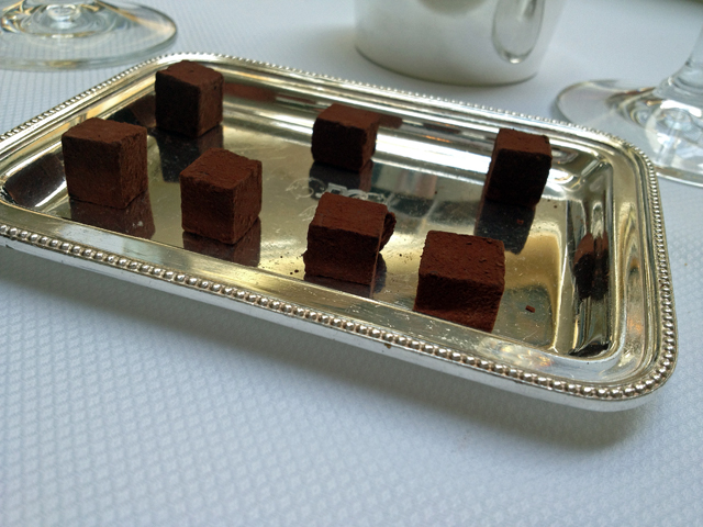 Once our lunch was over, they offered a batch of very small lemon-scented madeleines, fresh from the oven – comme il faut – and tiny cubes of a chocolate concoction that reminded me of flourless chocolate cake in texture and taste.  Superb!