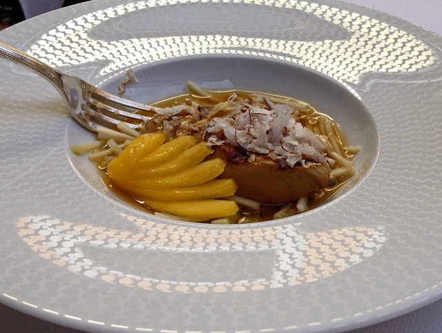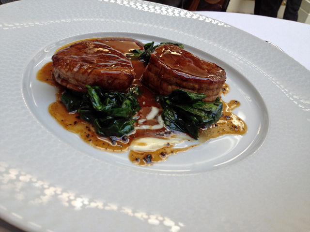 The restaurant offers many options for a lunch meal. You can order a la carte if you prefer, but a better deal is to pick one of their prix fixe menus. They have several kinds of menus: {Starter + main dish + dessert},  (Starter + two main dishes + dessert},  and also a more extravagant option with several desserts in very small portions at the end.  Their pastry chef,  Claire Heitzler, is well-known for adapting classic recipes and turning them into slightly lighter fair. That’s what we were told, but even with that assurance, we opted for one dessert only, merci beaucoup.   😉  Of course, Lasserre also offers a menu including one type of wine matched to each course, but I don’t care for wine at lunch (I know, I’m a bit odd, right?),  so Phil was happy sipping a single glass of Bordeaux with his meal.