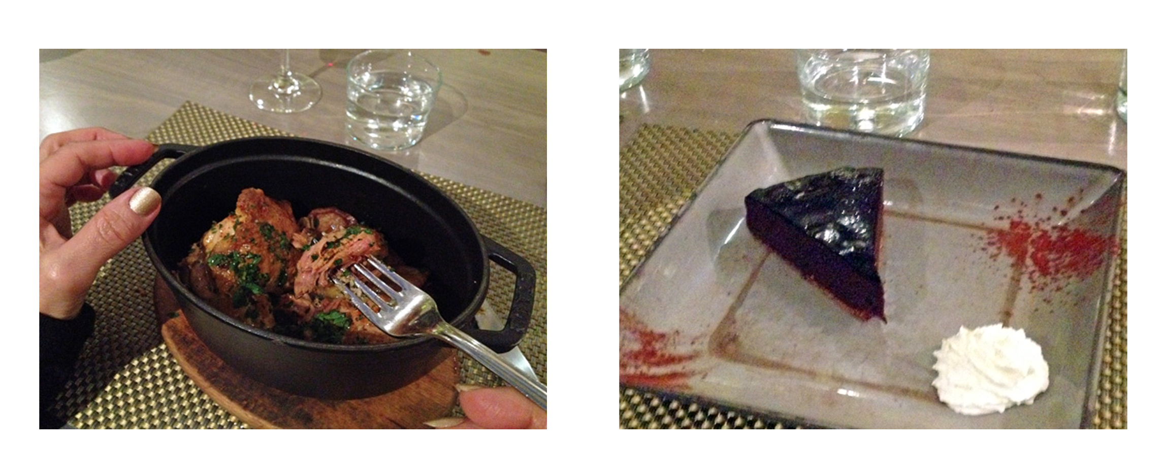 compositeWe both ordered the “cocotte du jour“, which happened to be a chicken with potatoes.  Delicious! But the best was probably the dessert we shared, “La Fabuleuse Tarte au Chocolat de Constant“. Outstanding. We learned from the waiter that one of Constant’s cookbooks for sale at the restaurant (and that I would later receive as a gift) has a recipe for tarte au chocolat, but guess what? The recipe in the book is NOT the same used for “La Fabuleuse” we enjoyed that evening. Constant tweaked that recipe up.  Oh, well…  better know the truth than be disappointed. Non?  🙂