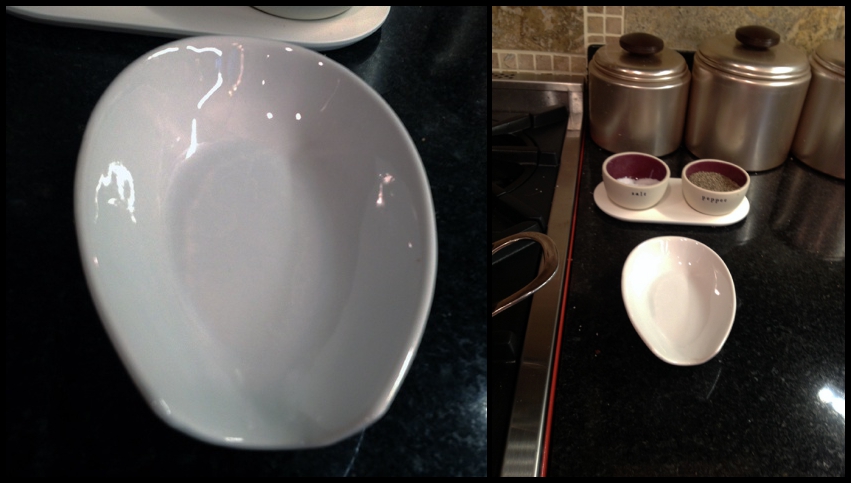 A spoon rest, found at Bed Bath and Beyond… I think it is a good match for the salt and pepper bowls… It works double duty as a place to rest a couple of eggs waiting to be scrambled, avoiding the dangers of them falling off the countertop cliff. Yes, that happened in a distant past. The experience was traumatic, to put it mildly.