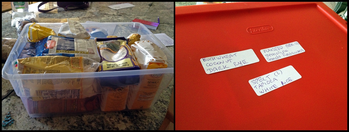 A huge plastic box to finally add some sense of organization to the flours I bring home. It lives in our freezer in the garage.The list of flours go not only on the top of the box, but is also stored in my iPhone. The goal? To prevent me from buying yet another bag of spelt flour, when two are sitting at home. (sigh)