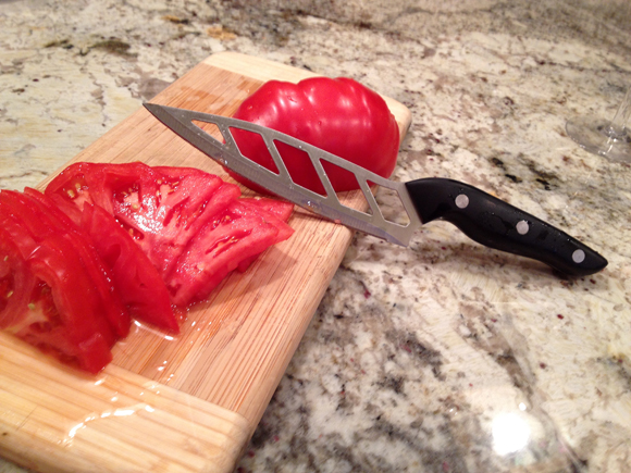 Another impulse buy from Bed Bath and Beyond. In my defense, it was on sale. Again in my defense, it had a photo of Ming Tsai on the box. He endorsed this knife, saying it never needs sharpening, and no food will stick to it. Perfect for tomatoes and cheese. Passed my test. Ming would never lie to one of his most loyal admirers. HA!