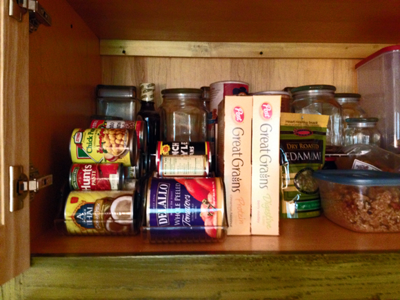 Still on the pantry subject, you win some, you lose some. I saw a tip on Food Network and jumped on the idea like Buck jumps on a snake (side note: last year he killed 8 snakes in our backyard, this year the first casualty happened a few days ago, he is incredibly fast!). Anyway, the tip was to buy plastic magazine holders like you see in the photo, and use them to store canned stuff, laying on their sides. Unable to find them anywhere, I went to amazon.com, but the ones I got were too narrow for that purpose. Bummer! At least they were very cheap, and are now holding…. cooking magazines! 😉