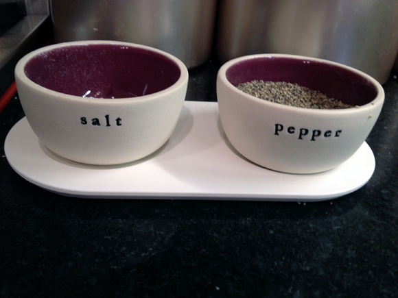 Something I’ve been craving for ages! I wanted to have salt and ground pepper ready to grab with a teaspoon or my fingers. Searched left and right for the perfect size, but nothing seemed to fit my dreams, until I found these on Paula’s shop at Etsy (Paulova Ceramics). You can custom order them in several different colors. Paula shipped them from Portland quite quickly, by the way. Just keep in mind that the base doesn’t come with it, mine was a support for some plastic containers. I am still amazed at how well they matched those bowls. As if they were made for that purpose!