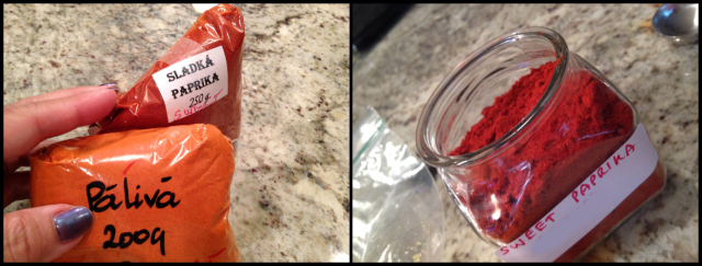 From our dear friend SL, two bags of paprika brought from Slovakia. You cannot imagine how strong they smell, they put any of the stuff we can buy here in the US into shame. He gave me two kinds, one sweet, one hot. Oh, yeah….
