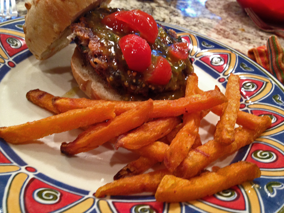Before you ask, I did not make the sweet potato fries, they were frozen entities by the brand Alexis, which we find quite tasty.  However, I did make the hamburger buns: a Wheat Berry Caraway bread that turned out as a great partner for these tasty burgers. Recipe shall be on the blog in the near future.