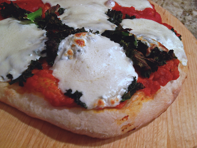 Spread enough pumpkin tomato sauce over the dough so that it covers it. You will have plenty of sauce leftover, use it for pasta or new fun experiments with pizza toppings. Sprinkle the kale over the sauce. Top with slices of the mozzarella and a sprinkling of parmesan cheese. Bake for 10 minutes or until done to your liking.