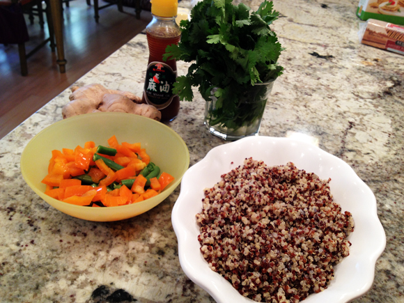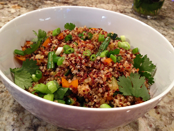 Comments: This was absolutely delicious! As you can read on her original post, this is the type of recipe you can use to clean up your fridge of all those veggies that wave at you when you open it, begging for attention. It is also a perfect use for leftover quinoa, although I cooked some earlier in the day just to have this side dish as our dinner. Asparagus would work great, but really any veggie could work, even chunks of roasted butternut squash, or eggplant. Just keep the soy, the sesame oil at the end, and don’t leave out the fresh ginger.