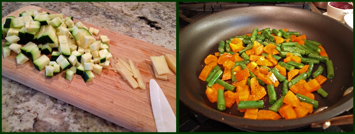 Add bell pepper and beans, toss or stir for a couple of minutes. Add zucchini and green onions and toss for a couple of minutes more.