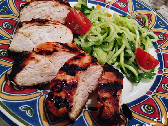 When I planned this dinner, I did not think it would turn out so delicious, and definitely not something that could go into my files of “Celebrate Wednesday“.  A simple grilled chicken served with a humble zucchini salad?   What could be so special about that?   Hard to pinpoint a particular reason, but I feel this meal was a gastronomic jackpot: the whole combination of flavors is perfect.  Refreshing, light, and satisfying.  You can change the salad around in lots of ways, as long as you add the dressing a few minutes before serving.  That will make sure the zucchini will get the right texture, losing some of its raw bite.  Fresh mint, shaved celery, shaved fennel, those are some of the ingredients that come to mind as add-ons. The chicken marinade will go with pretty much any protein. Including tofu, if you are so inclined…  😉