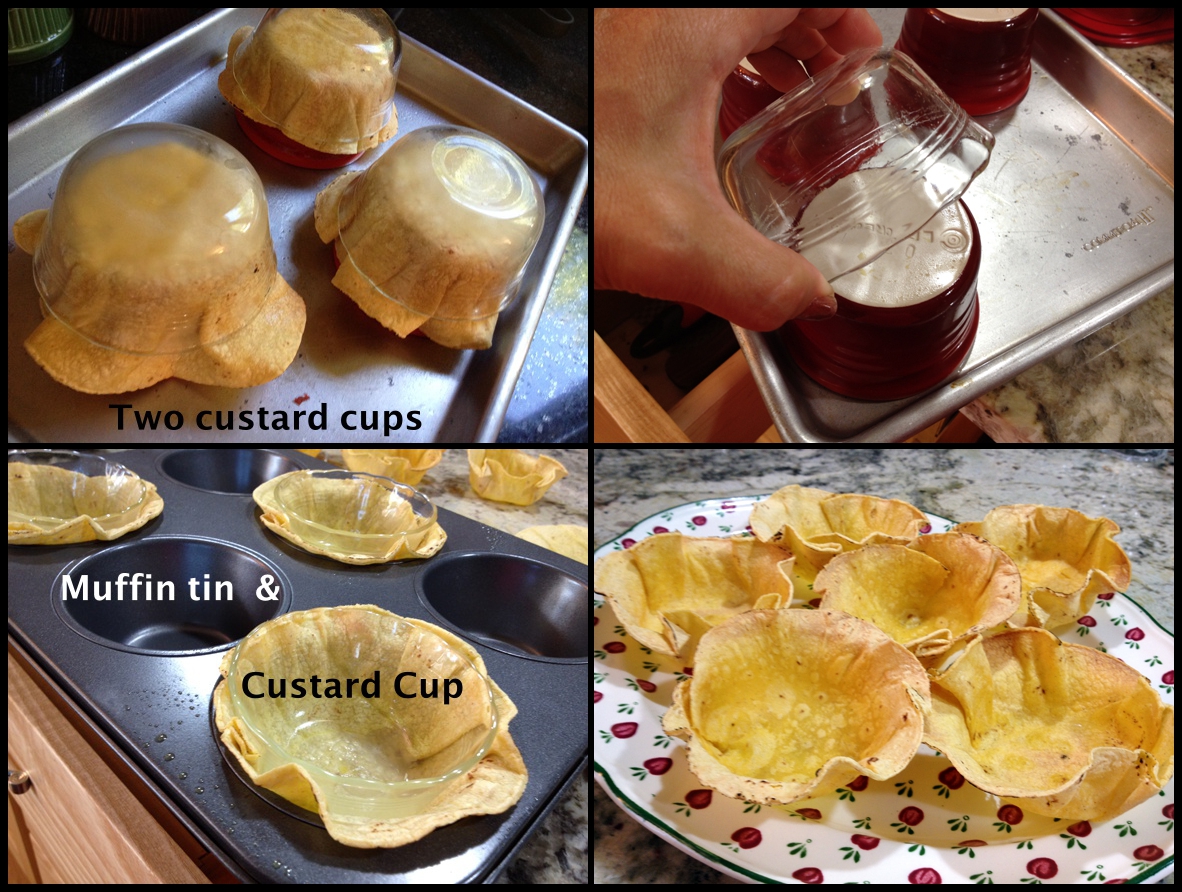 Here you can see some photos of my burning adventure with tortilla cups. You can do this in several ways, but I recommend the muffin tin + custard cup combo. Using the two custard cups nested together requires that they both fit just right not to tear the tortilla, and also makes it a lot harder to remove the top cup to brown the tortilla in the final moments of baking.