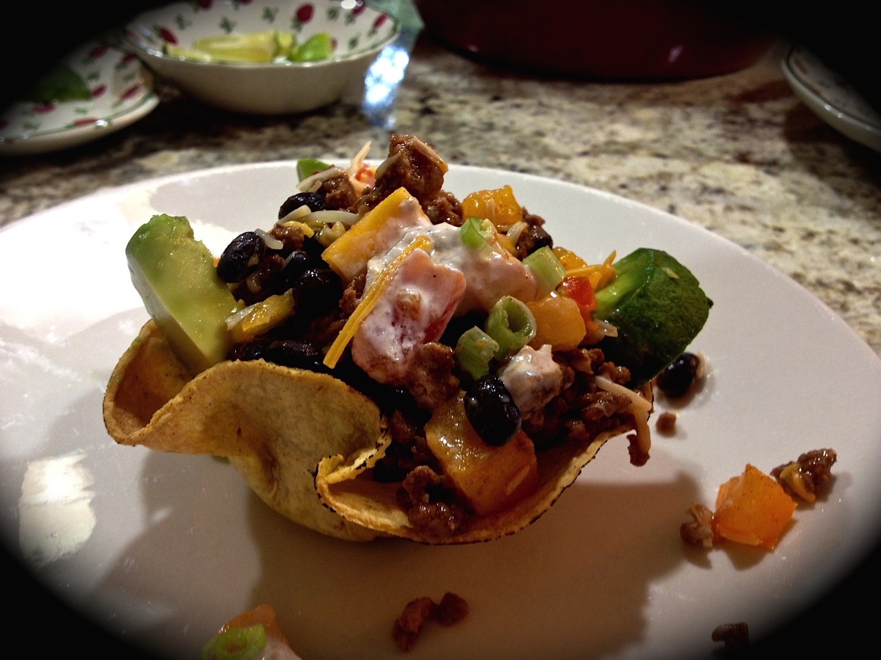 MAKING TACO BOWLS: Warm a corn tortilla very quickly over an open flame on your stove (I heard you can also use the microwave, but I haven’t tried it). Spray both sides of the warm tortilla very lightly with canola or olive oil spray. Immediately place in the muffin tin (or over a custard cup), and place another container on top to keep the shape. Bake in a 375 F for about 15 minutes, removing the custard cup in the final 5 minutes. Let cool over a rack.