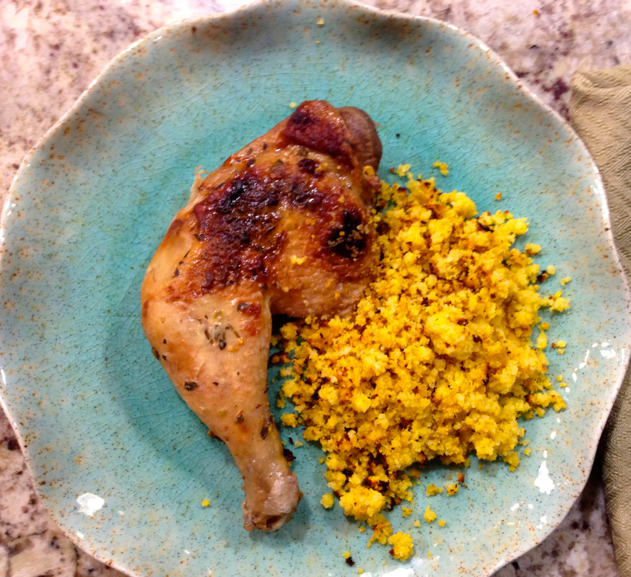 I’ve made it several times so far, and also used a yellow-orange cauliflower for a show-stopper of a side-dish. I love it. Love it. Period. Here it is, next to a roasted chicken leg made with a marinade that included a certain ginger syrup of my past.