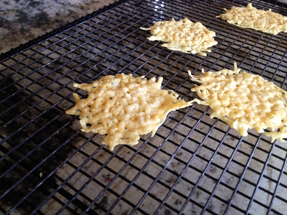 I’ve made this soup almost as many times as I made Mike’s Creamy Broccoli Soup. Sometimes I used chicken broth, sometimes a mixture of chicken broth and water. A squirt of lemon juice right before serving is a nice touch too. Cheese crisps pair very well with the zucchini. To make them I followed the method that Mike described in his original post for the broccoli soup. On the first photo of this post, I used a Cheddar type cheese, and in the photo below I went with Parmigiano-Reggiano. I like Parmigiano better, because it releases less oil as it bakes, and has that unique sharpness that contrasts very well with the silky soup.