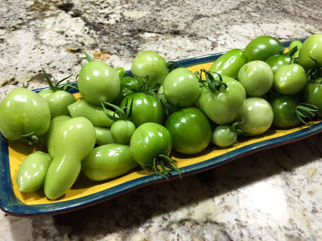 Green tomatoes harvested before the first frost (sad couple of words), now waiting in the kitchen, some might end up nicely red, but all will find their way into our meals one way or another…