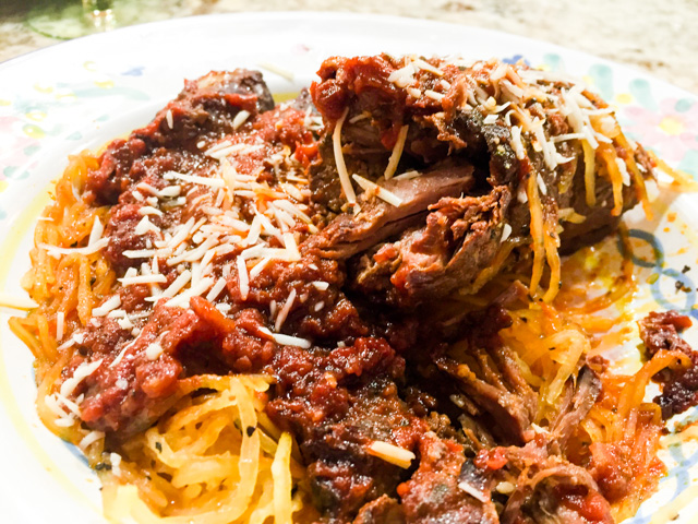 I enjoyed it with some spaghetti squash, but of course you can go the more authentic route of polenta, mashed potatoes, pasta, risotto… I prefer to balance a heavy dish with a lighter side. Do what feels right for you.
