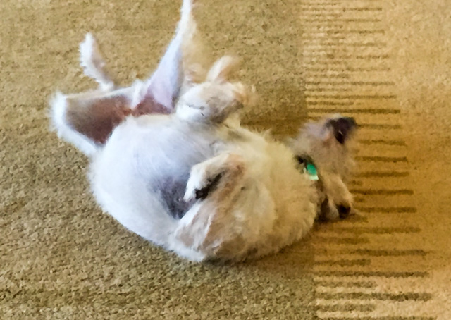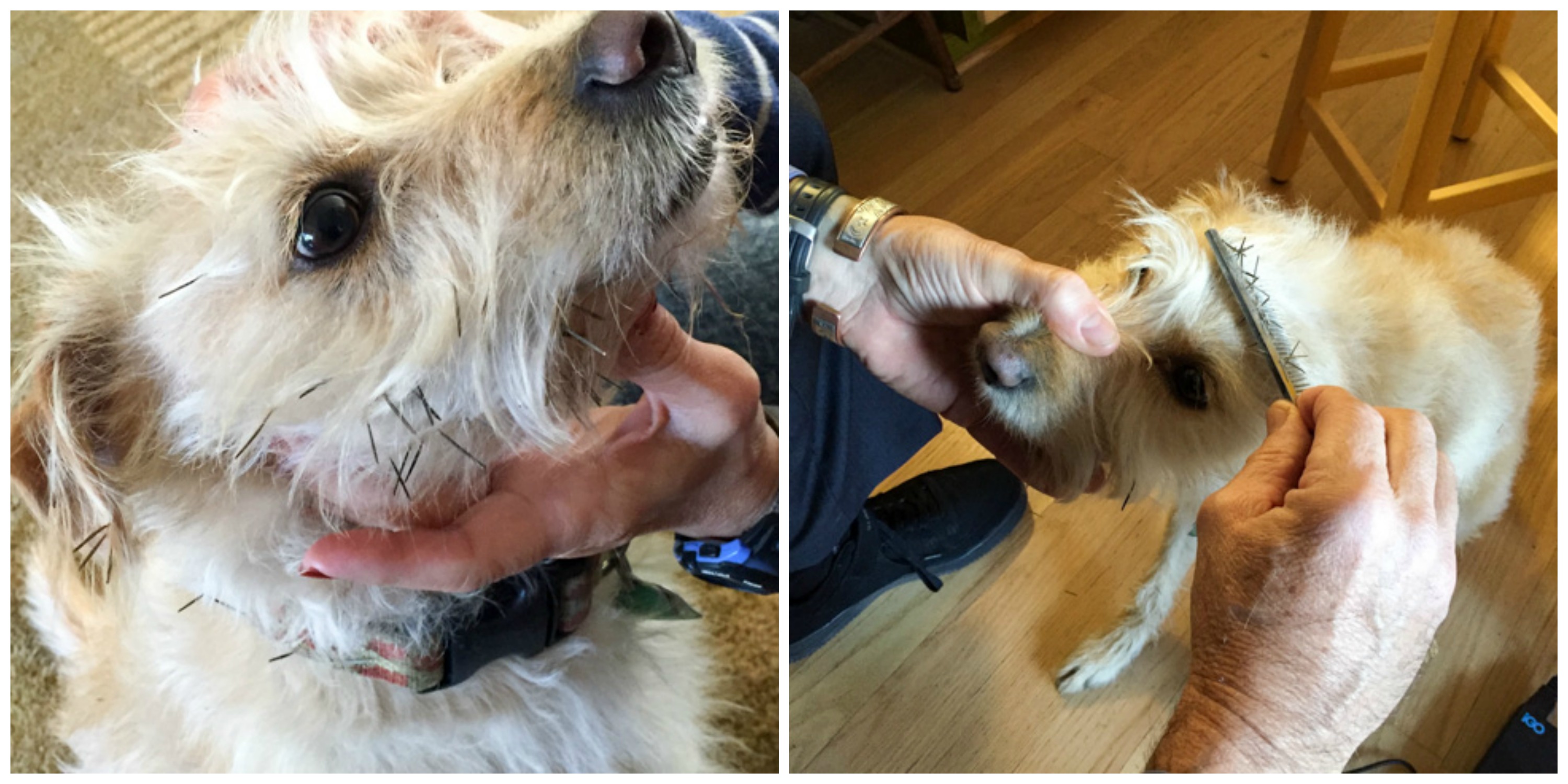 And he definitely does not learn from his mistakes. Here he is covered in burrs, once again having to go through the complicated process of combing them off. Quite a bit of whining and complaining, as if Daddy was skinning him alive (eye roll to the ceiling).